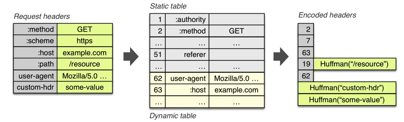 HPACK 不仅通过索引值来降低数据量,同时还会将字符串进行 霍夫曼编码 来压缩字符串的大小。