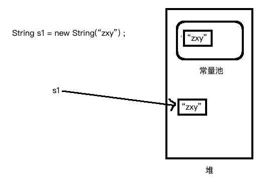 String s2 = new String("zxy"); // 加到堆,常量池有东西所以啥也不干
