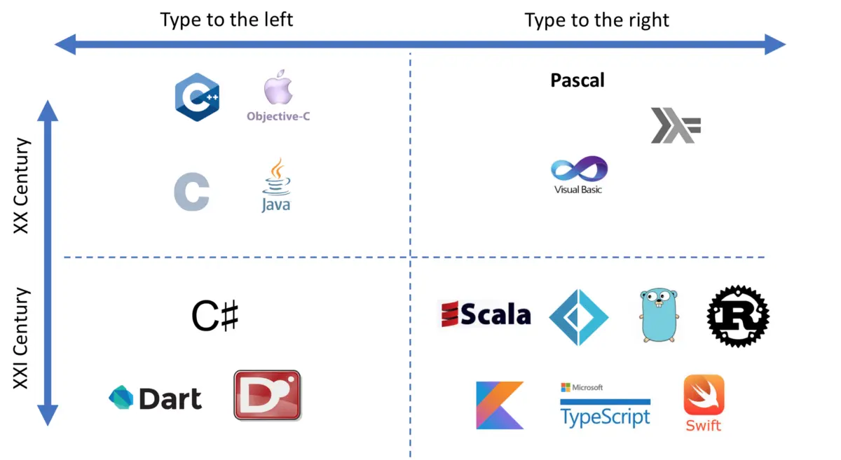 然而,如果你看一下二十一世纪设计的现代语言,你不禁会发现,一些受欢迎的语言越来越多地将类型放在名字的右边: