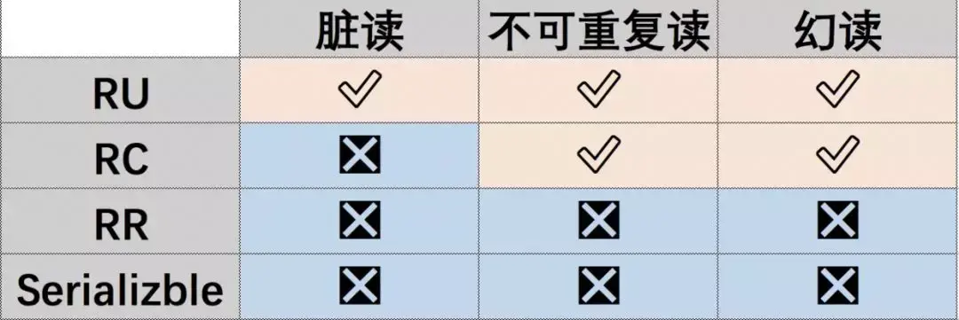每个级别都会解决不同的问题,通常是3 个问题:脏读,不可重复读,幻读。一张经典的图: