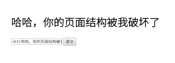 在输入框中输入 <h1>哈哈,你的页面结构被我破坏了</h1>,然后提交,效果如下: