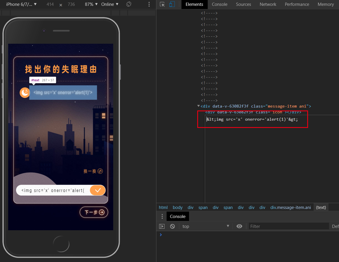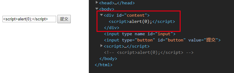 我们会发现没有弹窗,这里没有执行 JavaScript 程序的原因是:HTML 5 中不执行由 innerHTML 插入的 <script> 标签,但是在代码结构中可以看到被插入的代码片段。