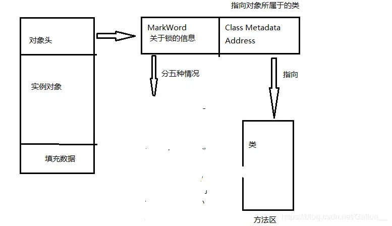 synchronized使用的锁对象是存储在Java对象头里的,jvm中采用2个字来存储对象头(如果对象是数组则会分配3个字,多出来的1个字记录的是数组长度),其主要结构是由Mark Word 和 Class Metadata Address 组成 。Class Metadata Address存储的是该对象属于类的地址,即可以判断这个对象属于哪一个类。
