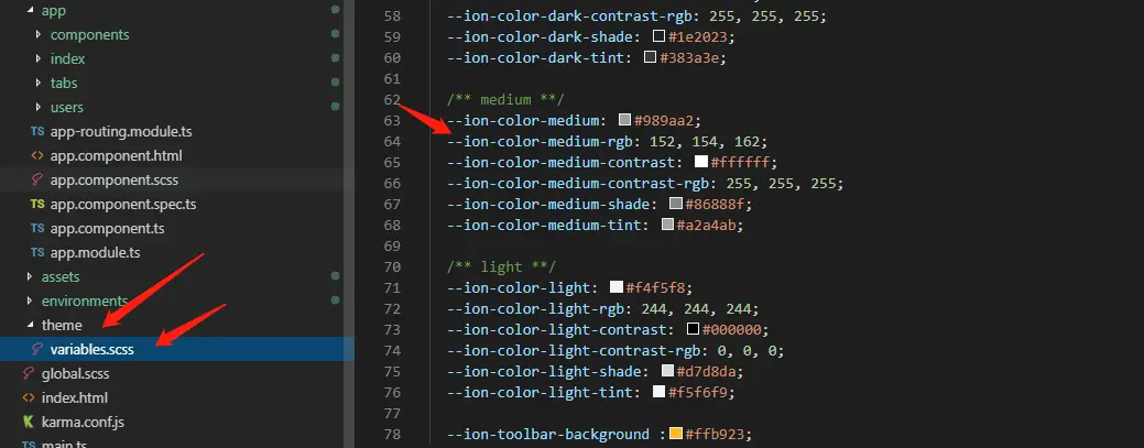 - 由于ionic样式是用sass框架写的,所以想改默认样式,必须先F12找出所定义样式的变量,然后重新赋值覆盖之前的。(修改默认样式的坑很大,祝好运~)