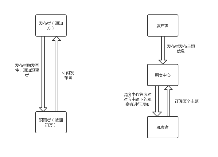 有些人认为观察者模式 === 发布者-订阅者模式,也有人觉得两者存在一些区别,其实两者的确有一些区别,但是两者的目的都是为了改善传统的通知机制,解耦通知方和被通知方的关系。那为什么发布者-订阅者模式存在区别呢?其实是因为后者相对于前者而言,多了一个类似于调度中心的存在,后者能集中管理多个主题对象,并且观察者和发布者之间是不存在直接关系的,在调度中心可以很方便的实现分发管理,这个特性让发布者-订阅者模式变得更加灵活。