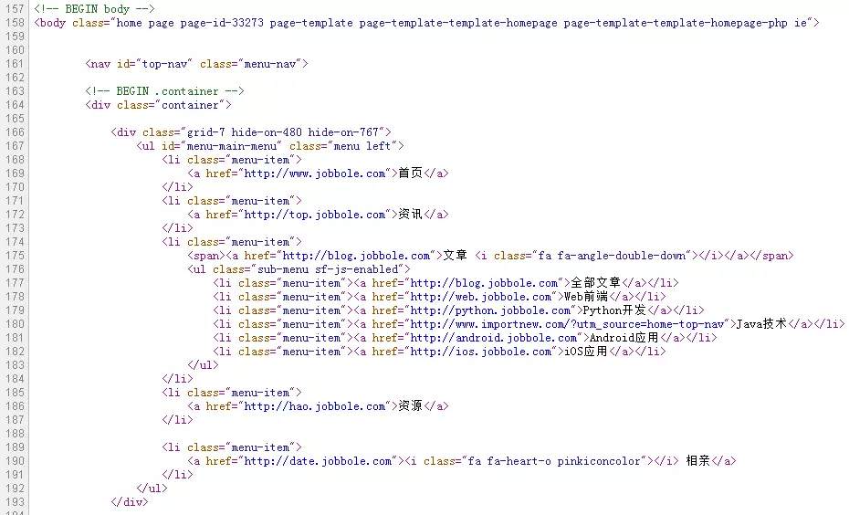 如上图中的红色框框中,class为属性,而等于号后边的“grid-5”即为属性值,有的时候节点内不只是一个属性,如上图中的196行中,就有两个属性。