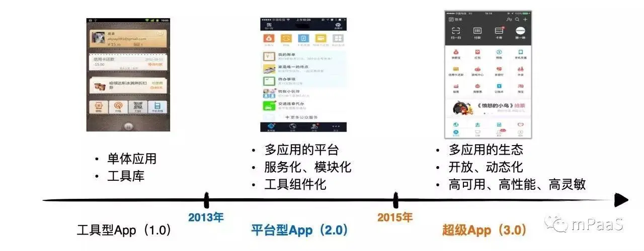 首先来快速看一下支付宝的架构演进,支付宝在移动端躬耕多年,从简单的工具型App到平台型、到现在的超级App。与目前市面上大部分App的发展路线类似,目前我们构建平台的同时,做了更多服务化、模块化的工作。
