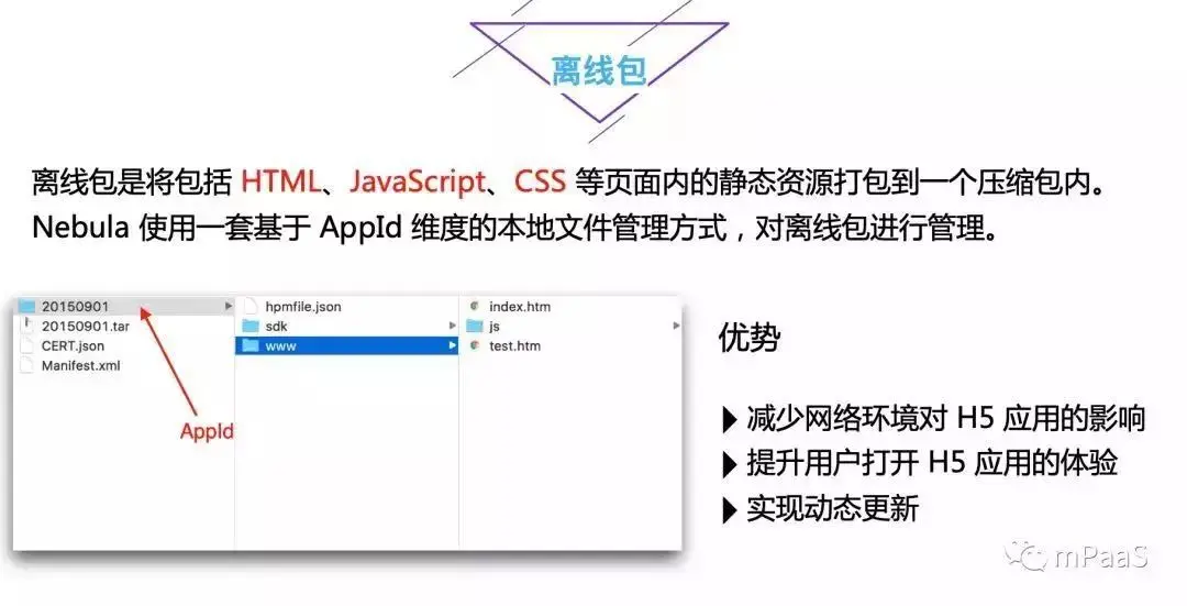 离线包是将 HTML、JavaScript、CSS 等页面内的静态资源打包到一个压缩包内,Nebula 使用一套基于 AppId 维度的本地文件管理方式,对离线包进行管理。这和前面提到的框架「积木的概念」如出一辙,每一个离线包都是一个小积木,这个小积木可以很方便的做到热插拔,实现动态更新。