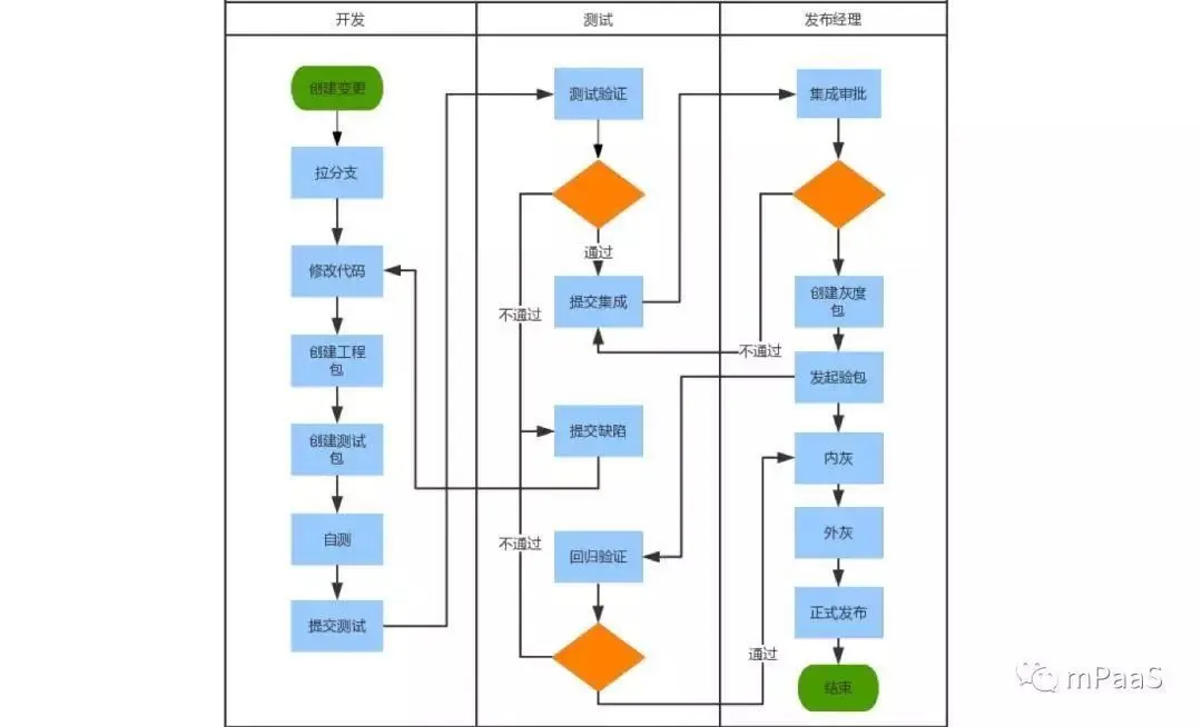 因此,基于前面介绍的各种开发框架,这里可以分享一下支付宝的研发流程,分为「开发、测试、集成发布」这些过程: