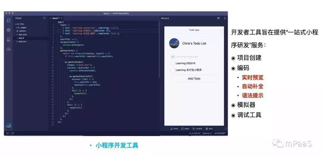 同时小程序还有自己的 IDE,帮助开发者能够实现「编码实时预览、自动补全、语法提示」等,从而大大提升了开发效率: