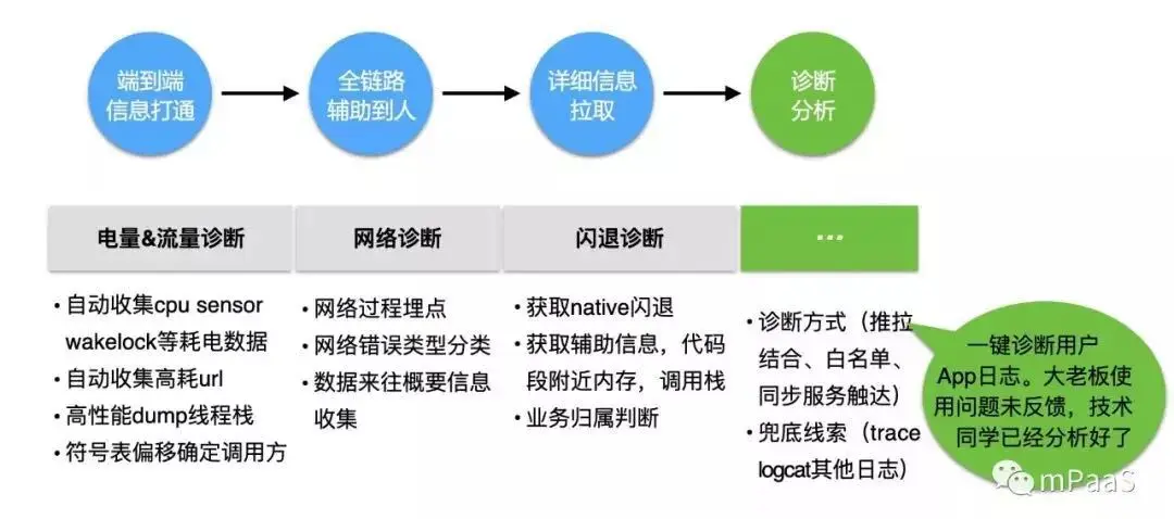 参考这张图,我们能够清晰地了解支付宝内部是如何进行问题诊断与定位:从“端到端的信息打通”到“全链路辅助到人”,“详细信息拉取”后在进行相应的“诊断分析”,同时会配备具体的诊断策略。