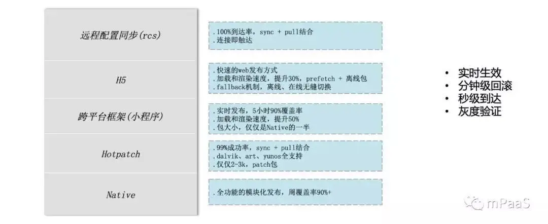 发布方式:目前基于“小步迭代”的选择,不依赖客户端发布点,从而达到随时发布的能力;