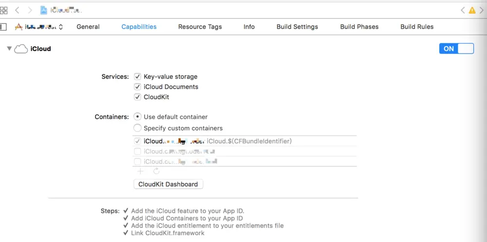 在工程里把 iCloud 功能打开,将容器添加上去,可能也会自动给你配置