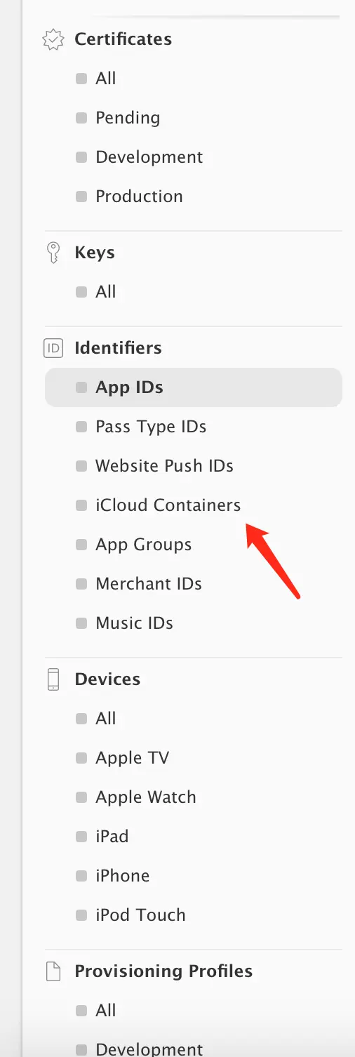 去苹果开发者中心添加 iCloud 容器,也就是 iCloud Containers,如图