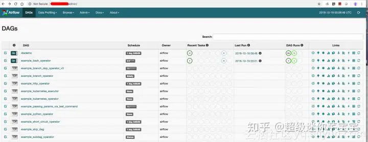 如果一切顺利的话,一个Airflow的集群就已经Ready了,可以在上面执行任务了。默认安装里面已经一些示例的任务, 浏览器里面输入 http://<你ECS的外网IP> 就可以看到Airflow的控制页面了: