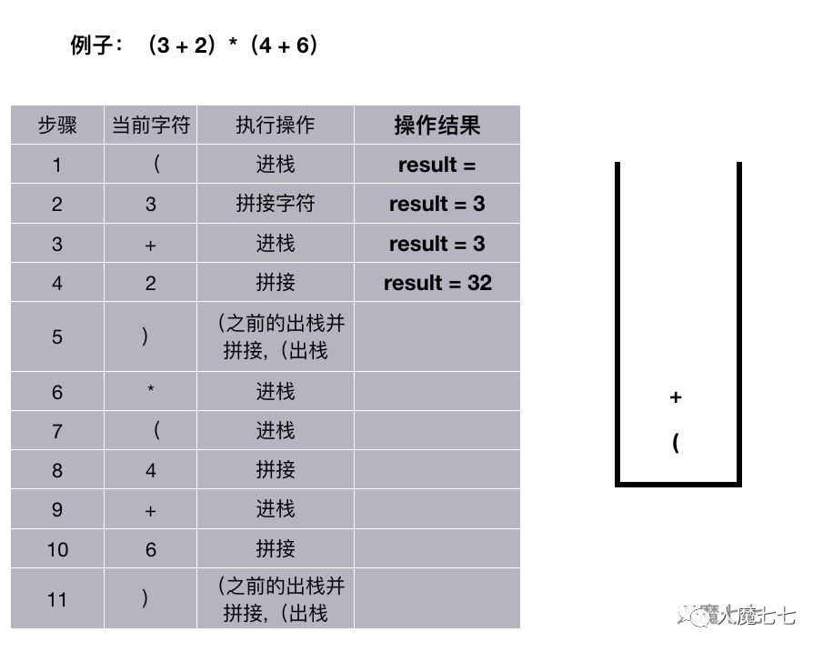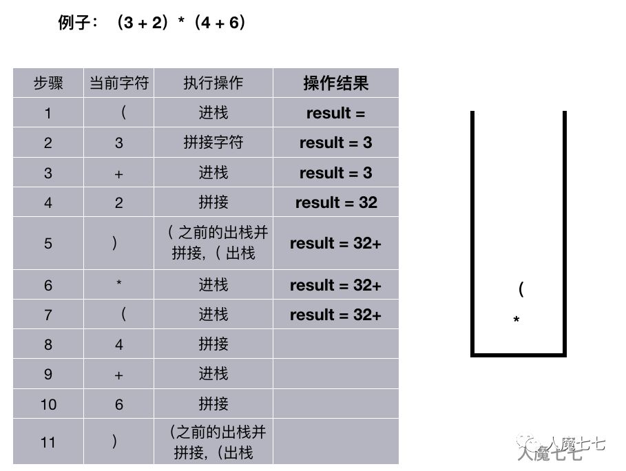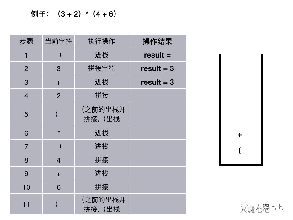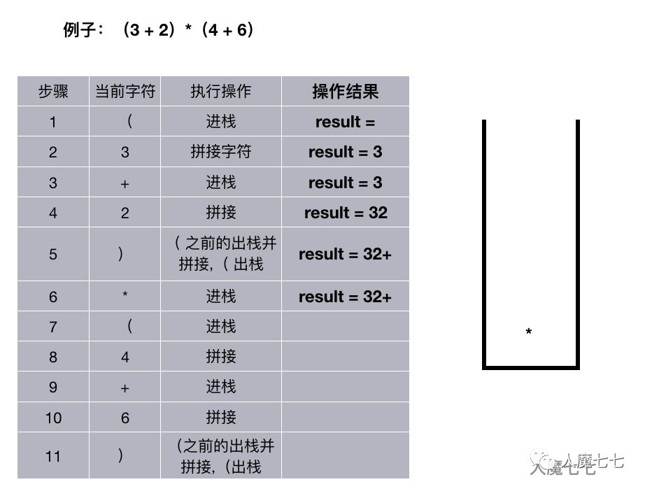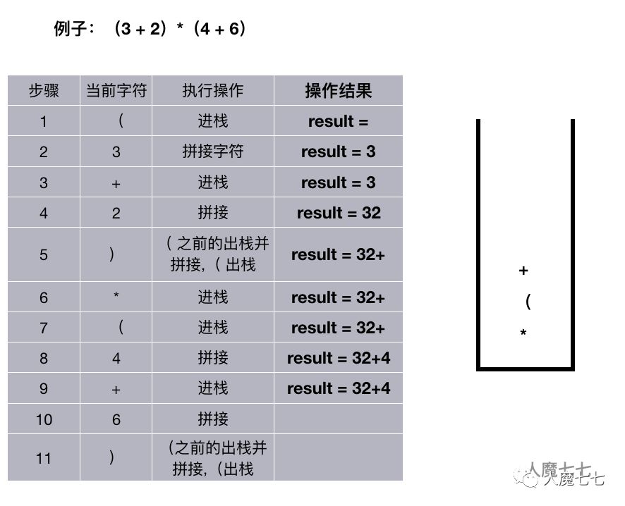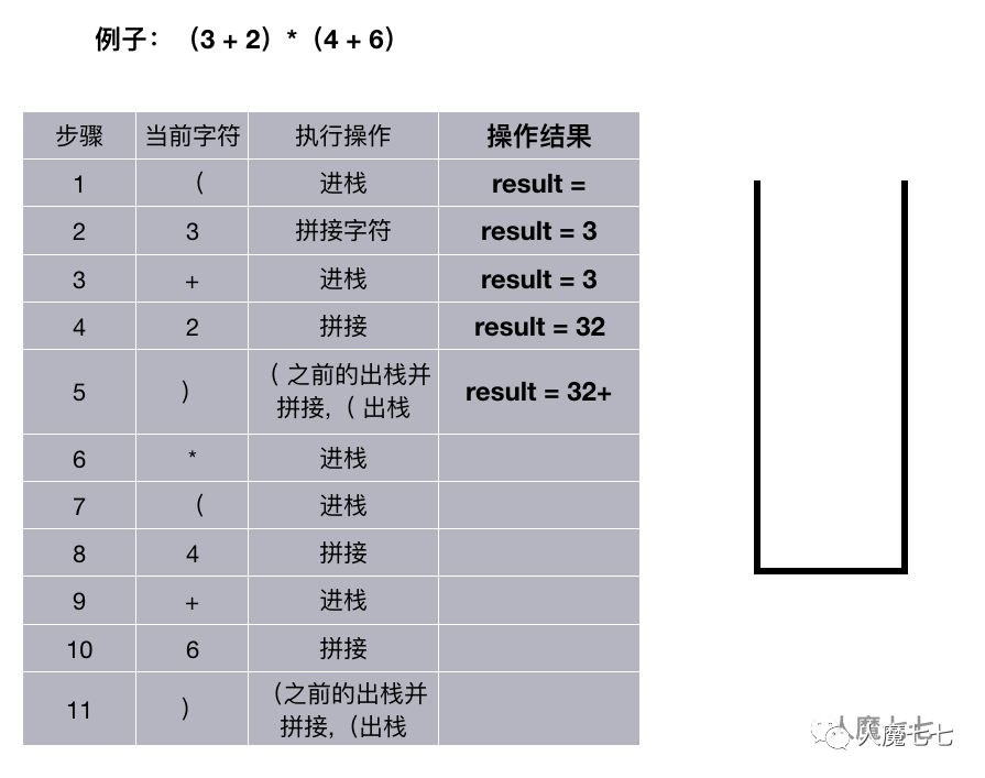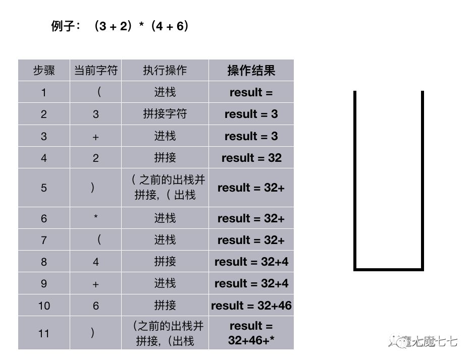 如果读取的是 + ,-,,/。如果栈非空并且这个( + ,-,,/ )优先级小于等于栈顶的元素的优先级,遍历出栈并拼接,否则进栈