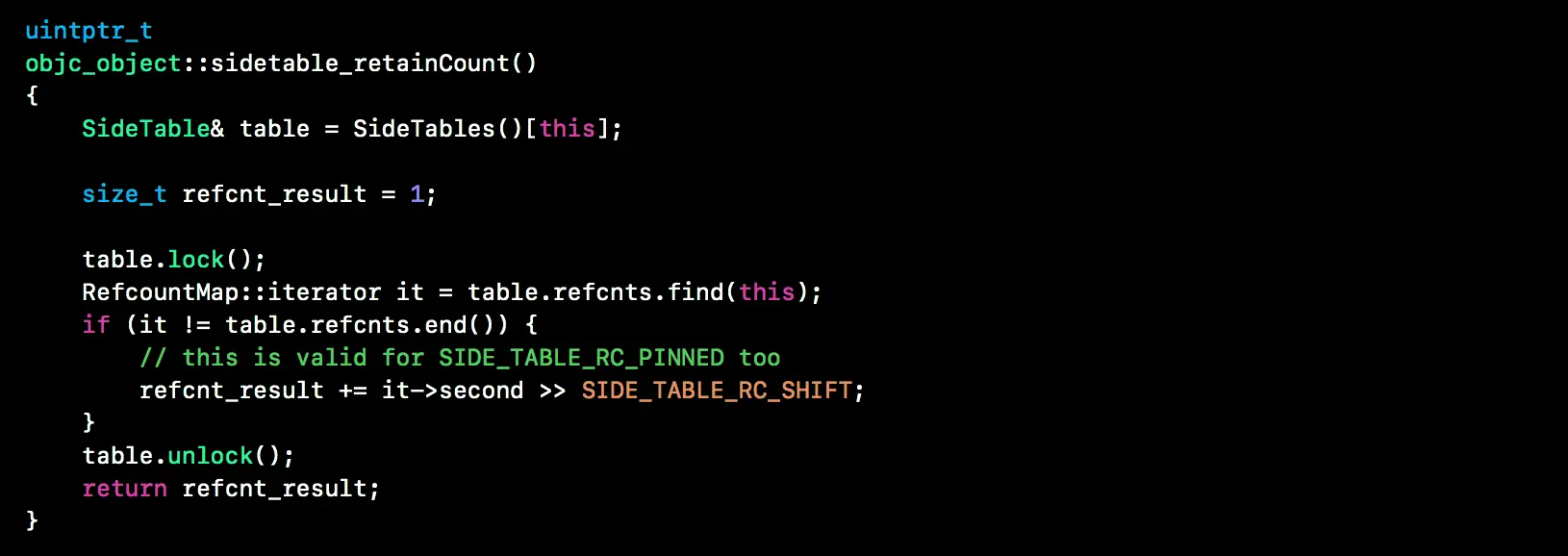 rootRetainCount函数, 可以看到引用计数的查找过程