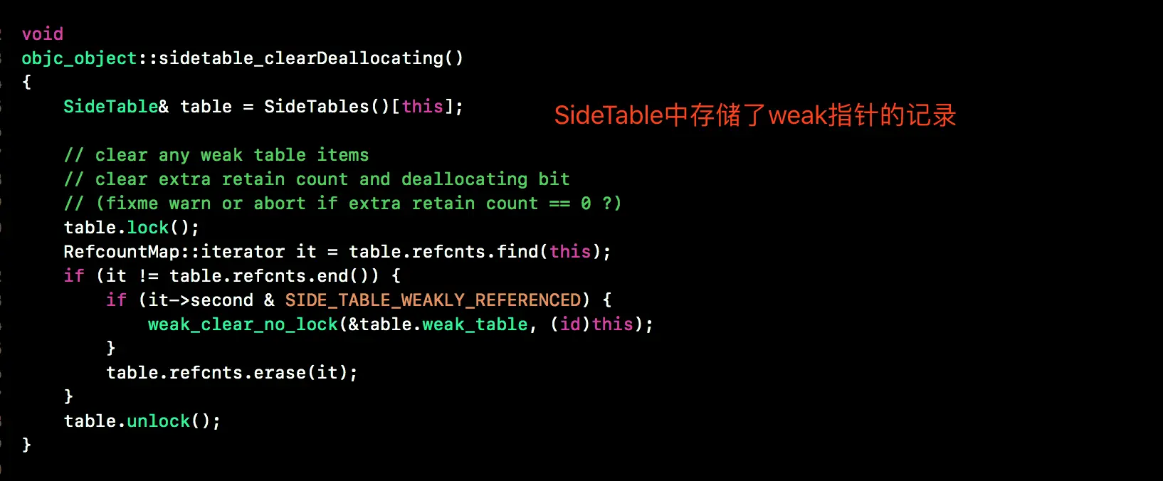 sidetable_clearDeallocating函数, 可以看到weak引用是存放到SideTable中的