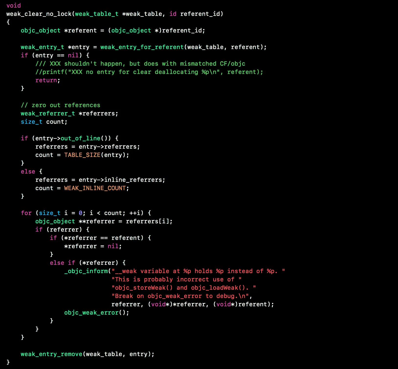 weak_clear_no_lock函数, 对弱指针置为nil, 同时移除删列表中的weak记录