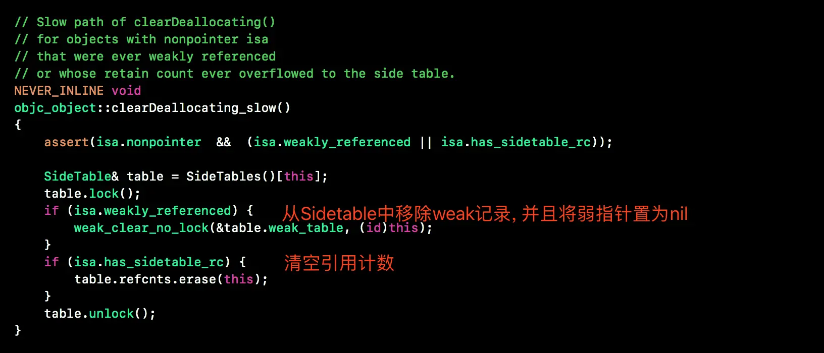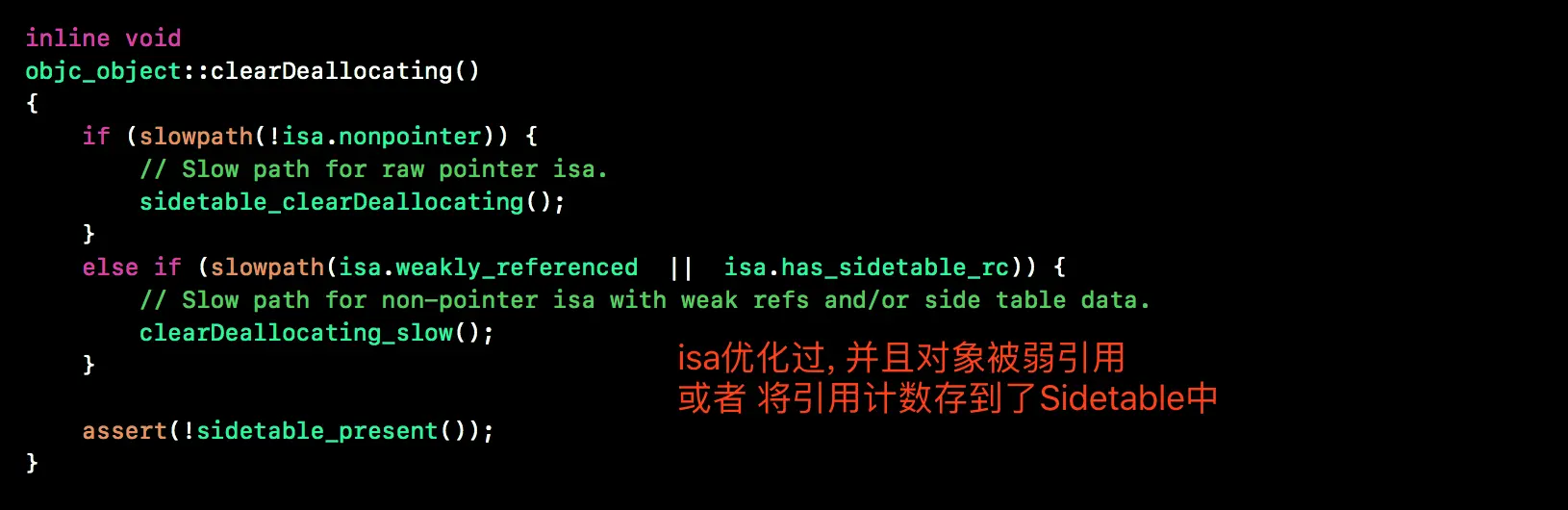 isa被优化过, 并且对象被弱引用或者将引用计数存到Sidetable中, 就会调用clearDeallocating_slow函数