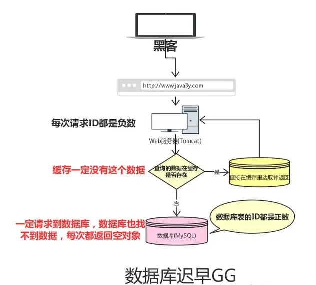 但是可能有黑客想把我的数据库搞垮,每次请求的ID都是负数。这会导致我的缓存就没用了,请求全部都找数据库去了,但数据库也没有这个值啊,所以每次都返回空出去。