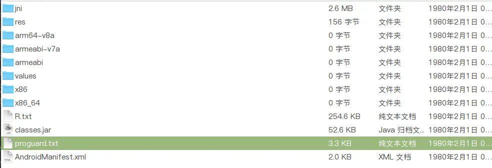 加上之后我们可以编译一次 aar,打开看一下,会发现里面多了一个 proguard.txt文件,一旦你的库被依赖,Gradle 会把这个规则与 app 模块的 Proguard 配置文件 合并后一起运行混淆,这样一来引用你 library 的人就再也不用担心混淆配置的问题了,因为你已经完全帮他做好。