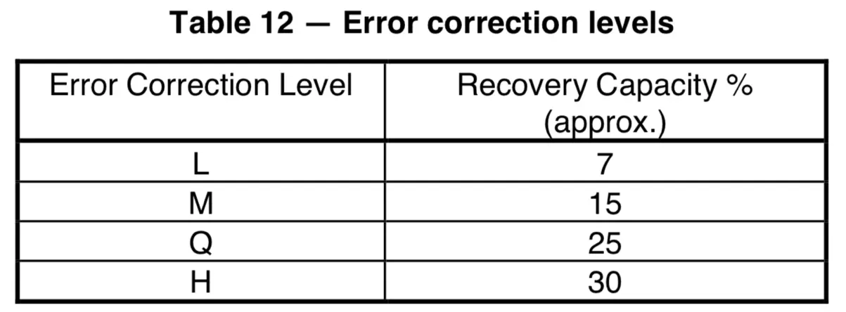 规范里明确了四个纠错等级,不同等级的纠错比例不同。