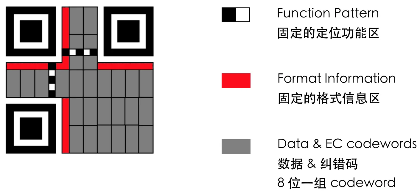 二维码可以简单划分为三个部分:固定的功能区(用于定位)、固定的格式信息区(比如二维码用的纠错等级和版本信息)、数据区。