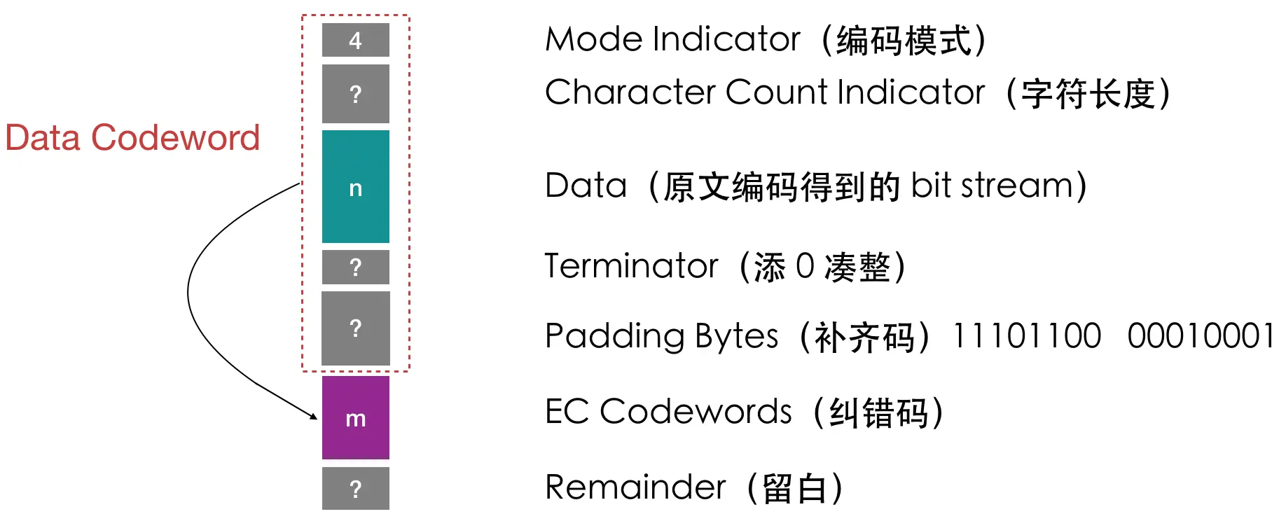 然后就是对数据按照指定的编码模式编译出的二进制序列。如果以上三部分的数据长度不是 8 的倍数,那么必须添零凑整(terminator)。