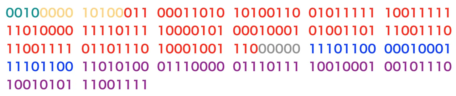 按 8 位一组重排,添 0 凑整:00100000 10100011 00011010 10100110 01011111 10011111 11010000 11110111 10000101 00010001 01001101 11001110 11001111 01101110 10001001 11000000。