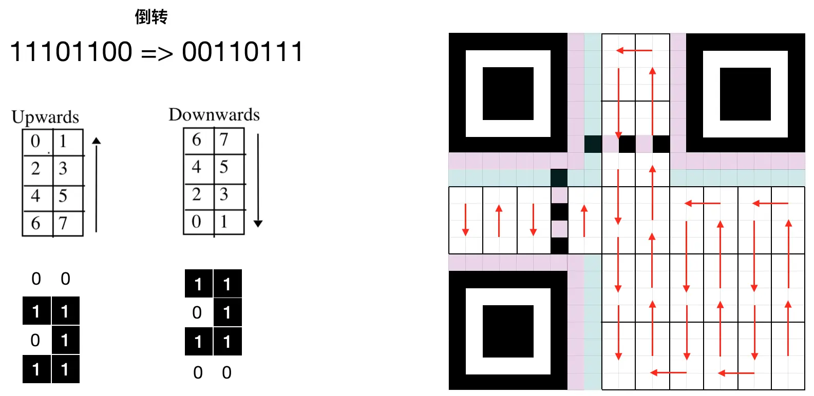 将数据按 8 位一组,从右下角开始蛇形往复填入 2 × 4 的矩形。具体怎么填规范里有明确规定,upwards 方向,将第一个数填入位置 7,第二个数填入位置 6 ... 这里是略有点坑的,因为不是从图中所示的 0 到 7,而是反过来的。方便起见,我们将数据倒过来,再按 0 ~ 7 的顺序依次填入。