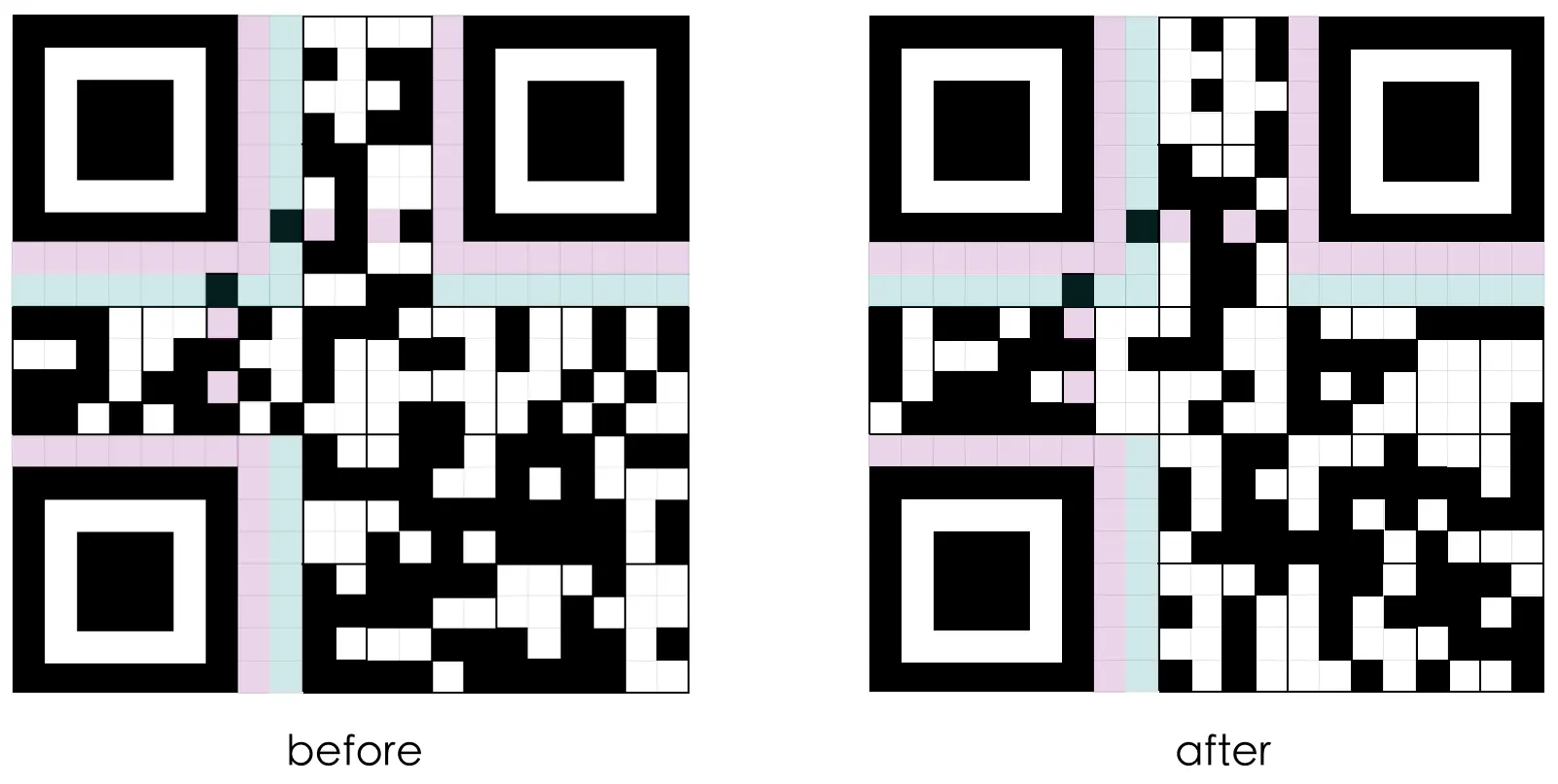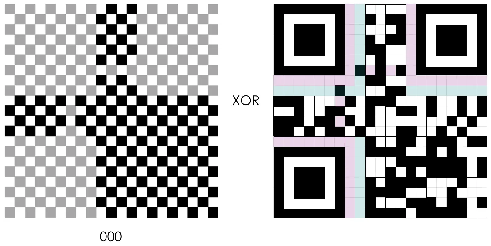 masking 的作用是使二维码的分布更加均匀。具体操作就是将数据区和 mask pattern 对应位置的比特做异或运算。比如数据区第 8 行第 10 列是白色 0,mask pattern 第 8 行第 10 列是黑色 1,异或运算的结果是黑色 1,那么就将数据区第 8 行第 10 列改成黑色。官方规定了八种 mask pattern(000 ~ 111),我们选用 000。