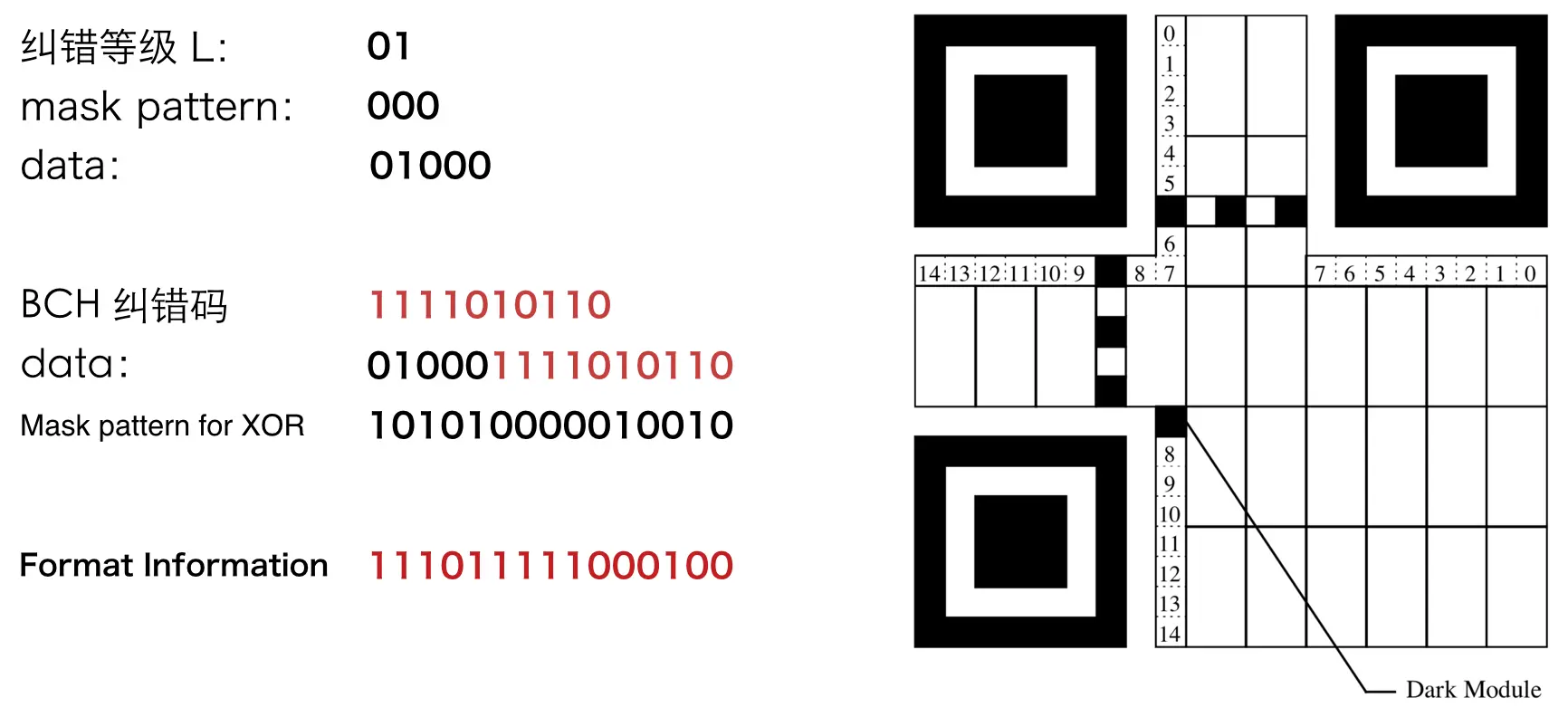对所有的版本,格式信息都是固定的 15 位。其中两个是纠错等级,三个是 mask pattern,剩下十个是纠错码。