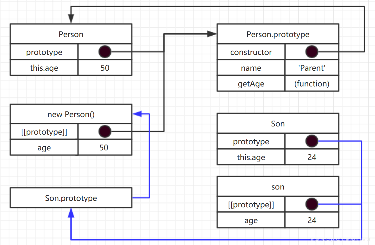 - 从 "Parent.prototype" 找 "getAge" 方法,找到并执行,函数作用域是 "son" 对象,所以返回 "24" 。