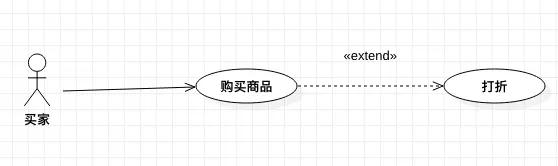 在 UML 图中,使用带箭头的虚线表示,并且虚线上标有 <<extend>>: