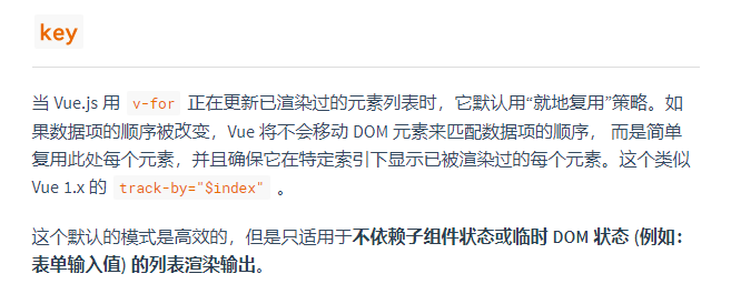 按照个人理解,因为key值是是使用了index索引去设置,当数据重新渲染的时候,因为子组件的数据是没有被追踪到,为了高效操作dom,不引起页面的reflow回流,所以vue会复用当前的元素(我们列表中有0,1,2三项数据即索引index,我们删除第0项的时候,列表中经过重新渲染成0,1,因为key值不是唯一性,按照‘旧地复用’策略,我们的第三项数据即是最后一项的数据删除掉)。 因此,我们在设置key的时候,要给key值设置成唯一性