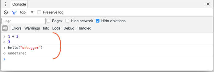普通用户看不到这个输出,它是在控制台里面的。要想看到它 —— 或者打开开发者工具中的 Console(控制台)选项卡,或者在一个其他的选项卡中按下 Esc:这会在下面打开一个控制台。