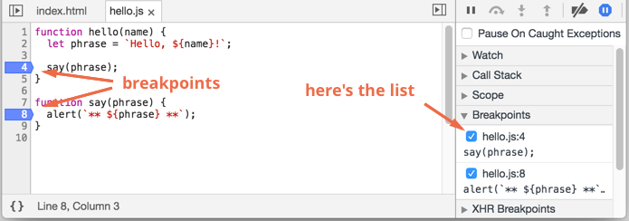 我们总是可以在右侧的面板中找到断点的列表。当我们在数个文件中有许多断点时,这是非常有用的。