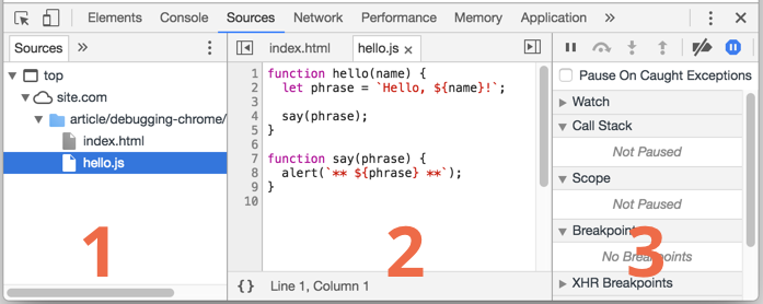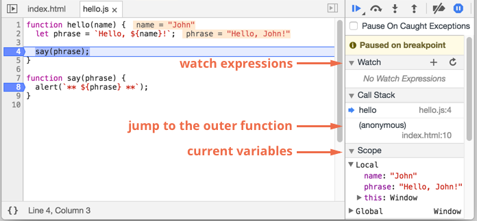 当代码被暂停时,我们可以检查当前的变量、在控制台执行命令等等。换句话说,我们可以调试它。