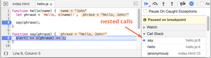 函数中的另外一个断点然后暂停在那里。看一下右边的 “Call stack(调用栈)”。它已经增加了一个调用信息。我们现在在say()