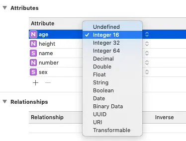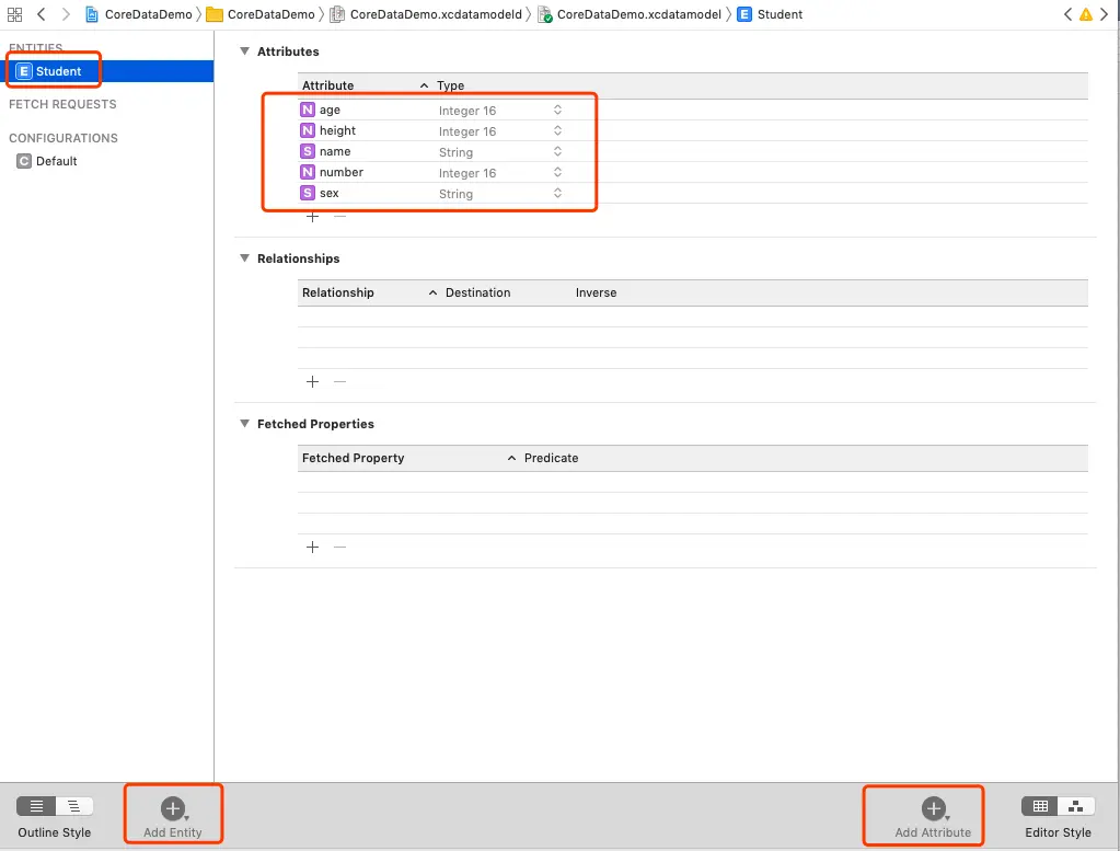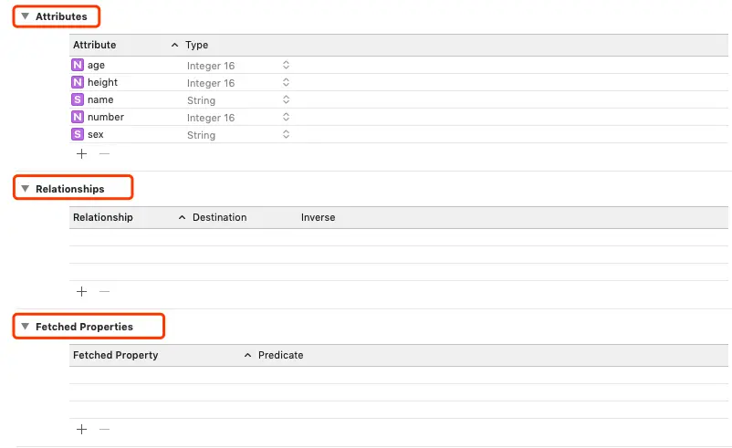 添加完一个实体后,你会发现一个实体是对应着三个内容,分别是Attributes、Relationships和Fetched Properties。