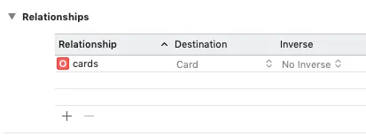 点击加号,可以添加关联关系,在inverse这个属性代表两个实体在Relationships设置关联关系后之后,是否可以从一个实体中找到另一个实体,这样使两个实体具有双向的关联关系。