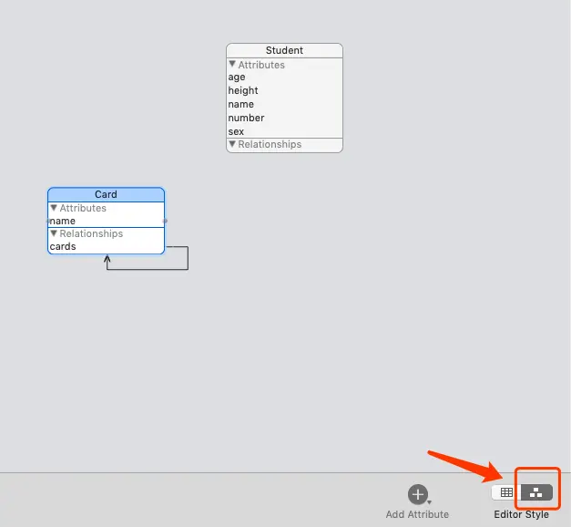 我们可以点开testCoreData.xcdatamodeld文件,我们可以看到实体和关系。如下图