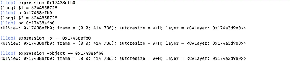 如:expression (就是 p/print/call)、expression -o(就是 po),打印一个UIView对象地址: