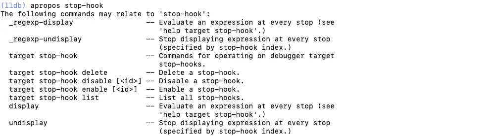 - target stop-hook、watchpoint 的增删改查命令与 breakpoint 的基本相同