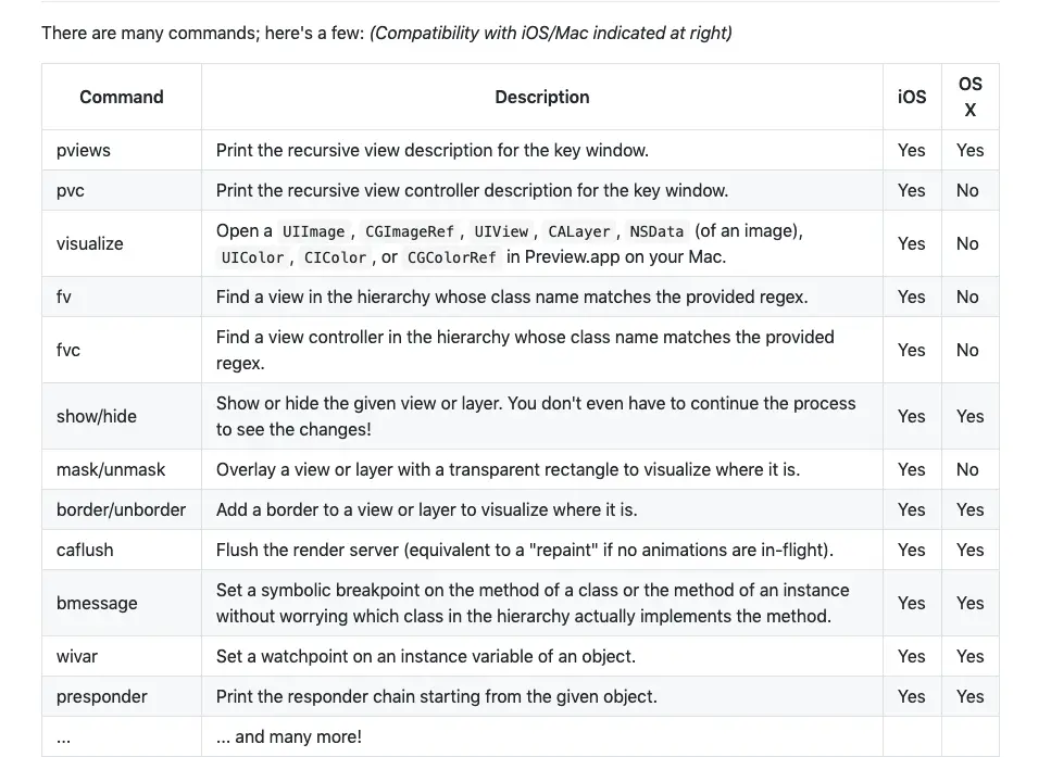 brew install chisel的安装过程这里就不赘述了,安装成功后,在~/目录下的.lldbinit文件中引入对应文件路径,增加一行:command script import /usr/local/opt/chisel/libexec/fblldb.py后保存, 重启 Xcode即可使用。它提供的快捷 命令清单及说明 这里也不赘述了。截个图感受下它的强大吧: -