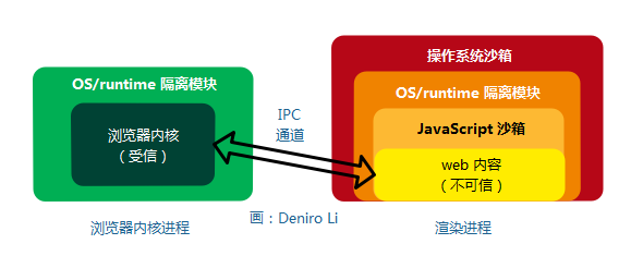 渲染进程被沙箱(Sandbox)隔离,网页 web 代码内容必须通过 IPC 通道才能与浏览器内核进程通信,通信过程会进行安全的检查。