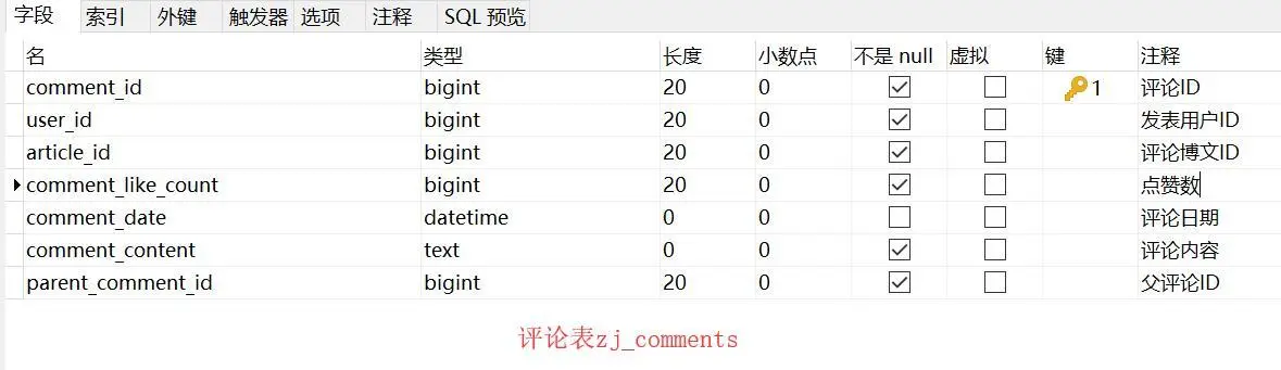 评论的相关信息如下:评论ID、评论日期、点赞数、发表用户、评论文章ID、评论内容、父评论ID。