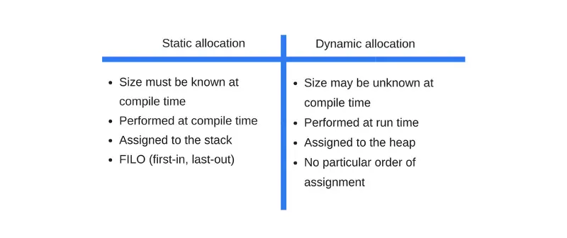 因为在这里,不能给变量在栈上分配一块空间。相反的,我们的程序需要确切要求操作系统在运行时有正确的空间大小。这样的内存被分配在了堆空间。下面这个表总结了在静态和动态内存分配的不同。