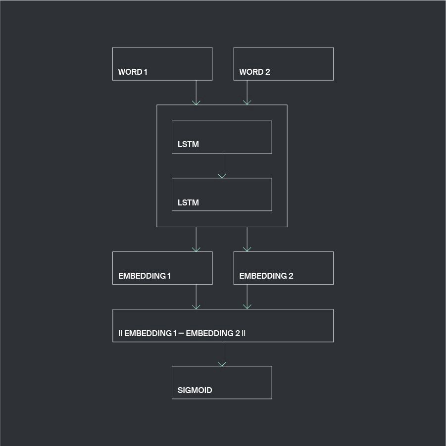 为了训练好模型,我们要使用一个包含 chars2vec 的扩展神经网络。更准确地说,我们的神经网络需要将两个 one-hot 向量序列作为输入,它们分别代表着不同的词,其次这个神经网络会使用一个 chars2vec 创建出它们所对应的词嵌入,然后计算出这些嵌入向量差值的范数,最后将这个结果反馈给网络最后一层的 sigmoid 激活函数。这个神经网络的输出范围是 0 到 1。